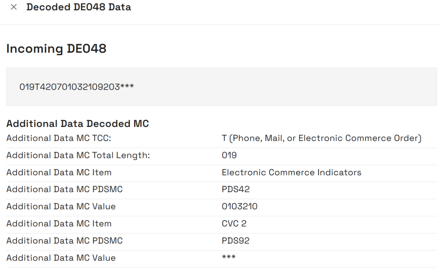 The details displayed depend on the type of transaction. For example, fields relating to presentments, such as Settlement Amount (DE005), are blank for authorisations.