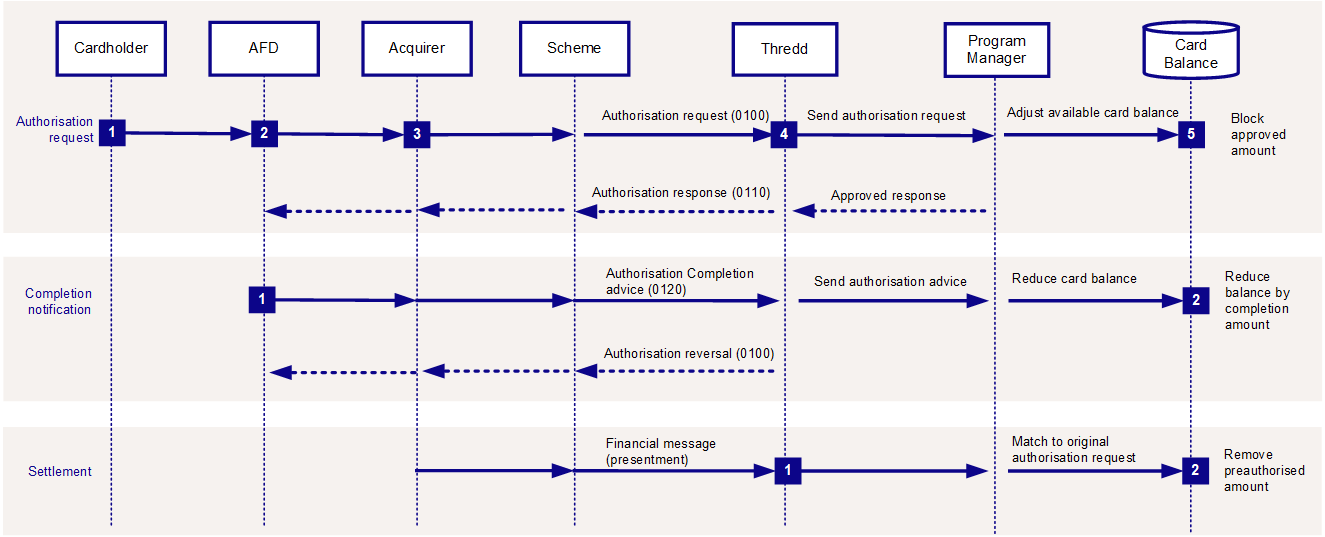 Automated Fuel Dispensers (AFD) are unattended terminals at fuel stations that allow cardholders to purchase fuel without requiring an attendant. Authorisations from AFDs work slightly differently to other types of authorisations. The initial amount authorised may be followed by an authorisation completion advice for either a higher or a lower amount. In EHI modes where you maintain the card balance, you should return an authorisation decision (approve or decline) and then update the blocked amount on the card, to reflect the new authorised amount.