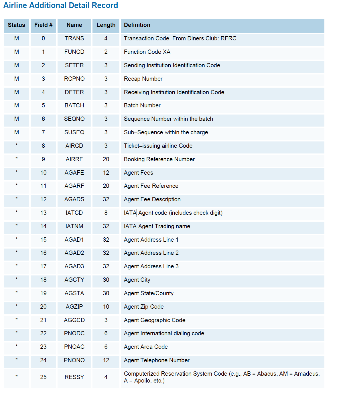 - To find information on the Airline Additional Record detail, search for the Airline Additional Detail Record section. This section contains information on the data within the above example, such as the IATA Agent Trading Name. The table within the page appears as follows: